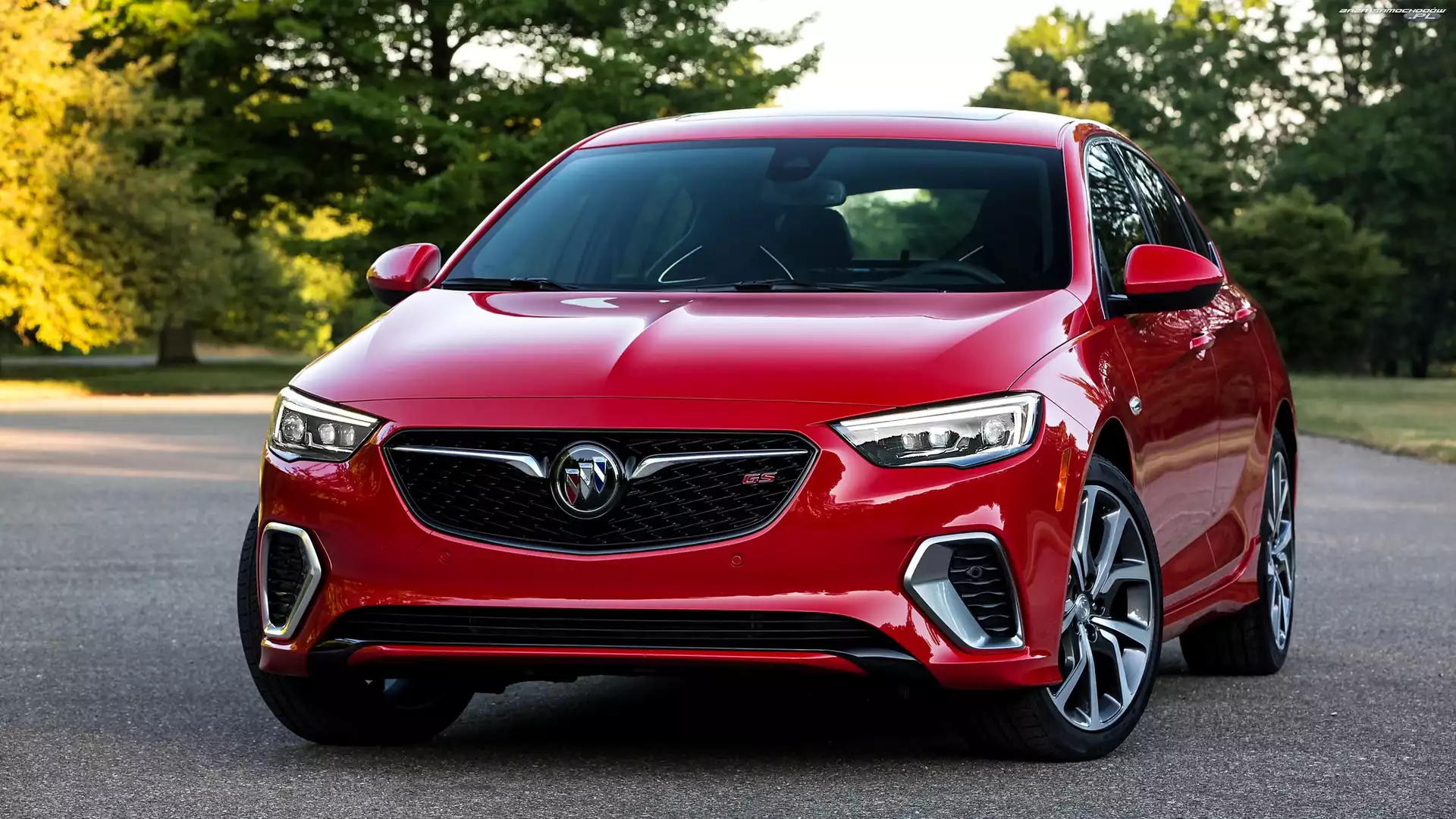 Buick Regal VI, VI generacja Buick Regal VI GS, VI generacja Graffiti, Tył, Buick Regal Tył, Buick Regal GS, Lampy Buick Regal Sylwetka, Buick Regal GS, Sportowa Buick Regal Sportback Powietrza, Buick Regal GS, Wloty Reflektory, Buick Regal GS, Atrapa Drag, Buick Regal, Wyścig Brembo, Buick Regal GS, Zaciski Biały, Buick Regal GS Przód, Buick Regal GS Drzewa, Droga, Buick Regal GS, Czerwony, 2018